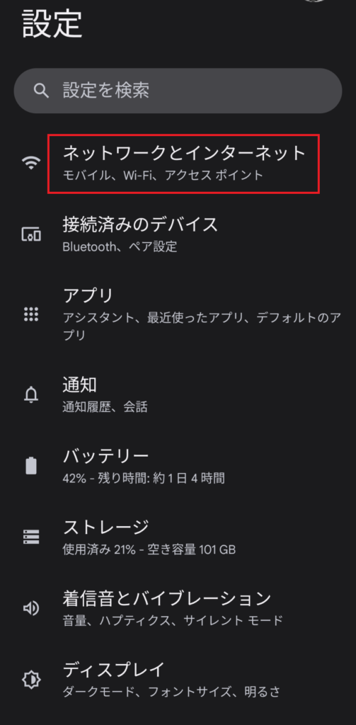①「設定」を開き、「ネットワークとインターネット」をタップ