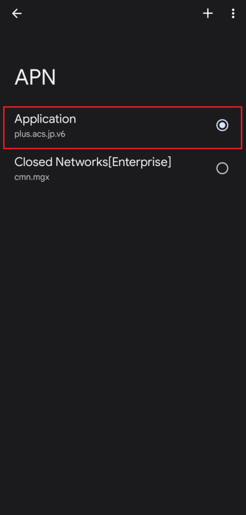 「APN」の項目に「plus.acs.jp」がない場合は、+マークから新しく設定しましょう。